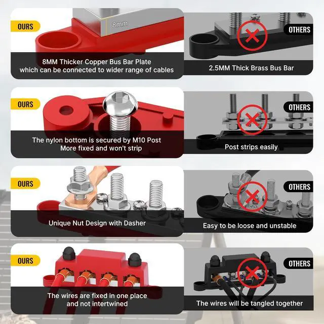 Stud Terminal: The battery copper bus bar terminal block includes 4 x 3/8" studs and 3 x #10 (M5) screw terminals, which makes the 12V junction block able to accept larger size terminal connectors and wires. The nylon bottom is also secured by M10 post which makes it more fixed and won't strip ^^
