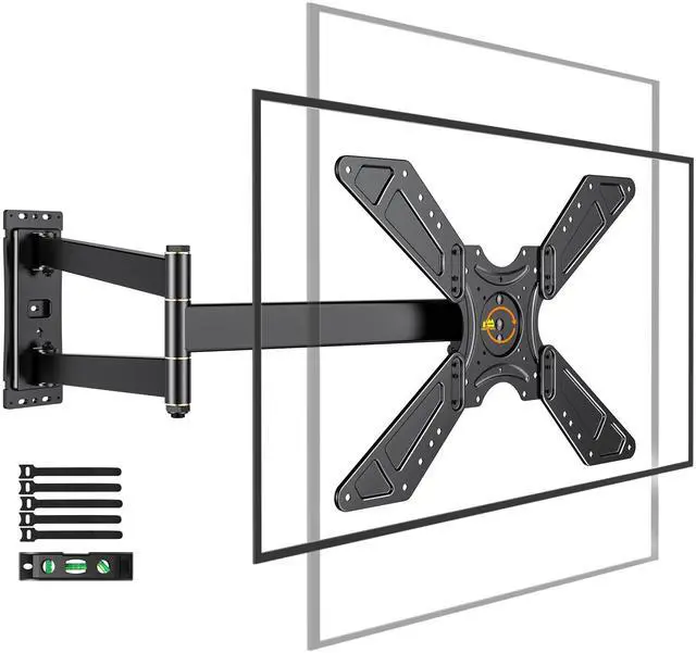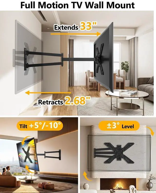 Ultimate Space-Saving Corner TV Mount - Maximize your living space with our innovative corner TV wall mount. Designed specifically to fit snugly into any corner, it frees up your main wall areas for other furniture or decor. This is the perfect space saving solution for apartments, bedrooms, or man caves where every square foot counts, providing an optimal viewing angle without the bulk. ^^ Maximized Flexibility - Get the right TV position and viewing angle. This extra long arm TV wall mount can extend 33 from wall to cover more viewing positions and retract 2.5 to wall for saving space and a clean look.
