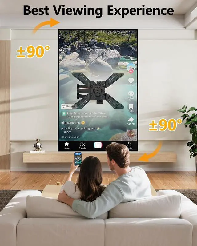 Our full motion TV wall mount swivels +/-90, rotate 90, tilts -10 to +5. Additionally, theres +/-3 post-install leveling to precisely align the TV even after installation. ^^ Rotate Screen Vertically or Horizontally - Unlock next-level functionality with the ability to rotate TV wall mount orientation. Seamlessly switch your screen from a standard horizontal layout to a vertical one, ideal for browsing social media feeds, reading digital documents, or playing mobile-style games on a giant display. This Vertical and horizontal screen switching feature transforms your TV into a versatile digital center.
