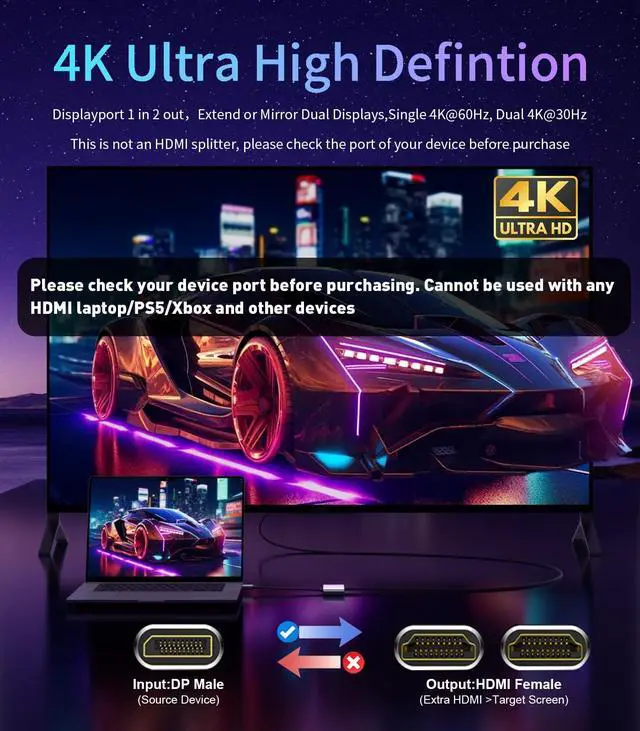 How to use: Plug the male DP connector into the source device (PC, laptop, graphics card); Connect the included USB cable; Connect the 2 HDMI females to the monitor via HDMI cable range. Please note, 1. HDMI cable needs to support 4k.