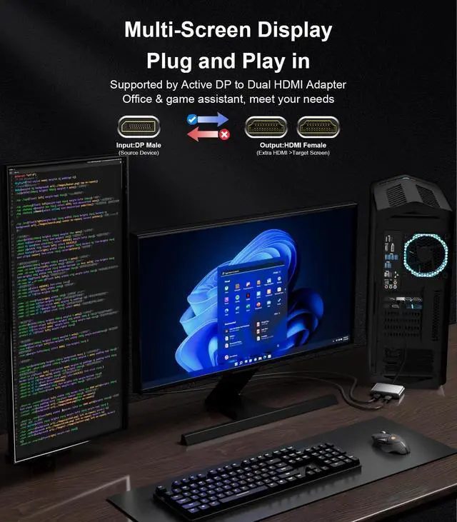 Play: This DisplayPort to Dual HDMI Adapter is plug and play, no driver installation required.