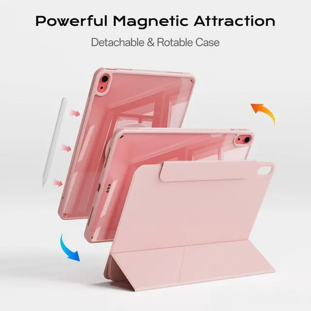 Clear Case for iPad A16 11th Generation 11 inch 2025 & iPad 10th Gen 10.9 inch 2022 with Pencil Holder, Detachable Magnetic Rotating Transparent Hard PC Back, Auto Wake/Sleep, Trifold & Y Stand, Pink