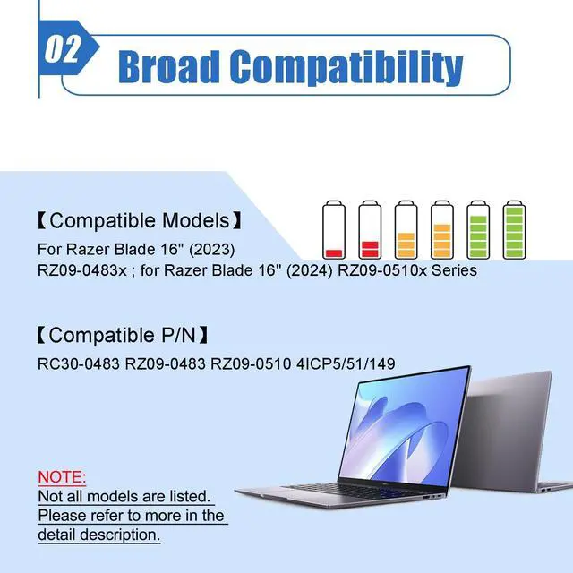 Battery Color: Black ^^ Compatible P/N RC30-0483 RZ09-0483 RZ09-0510 4ICP5/51/149 ^^ Compatible Laptop ModelsFor Razer Blade 16" (2023) RZ09-0483x; for Razer Blade 16" (2024) RZ09-0510x Series ^^