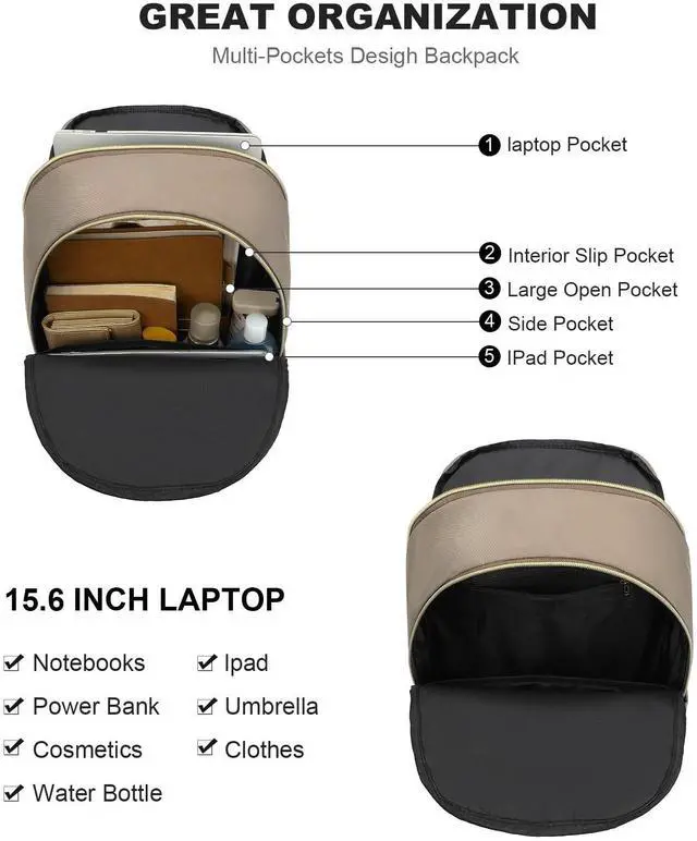 Mutil Functional Compartment: Features a total of 5 compartments plus 2 side pockets. It includes a dedicated, padded laptop sleeve that fits up to a 15.6 -inch laptop. The spacious main compartment can store headphones, business files, and daily essentials. Additionally, three front organizer pockets provide ample space for cards, wallets, sunglasses, and other small items, keeping everything neatly arranged ^^