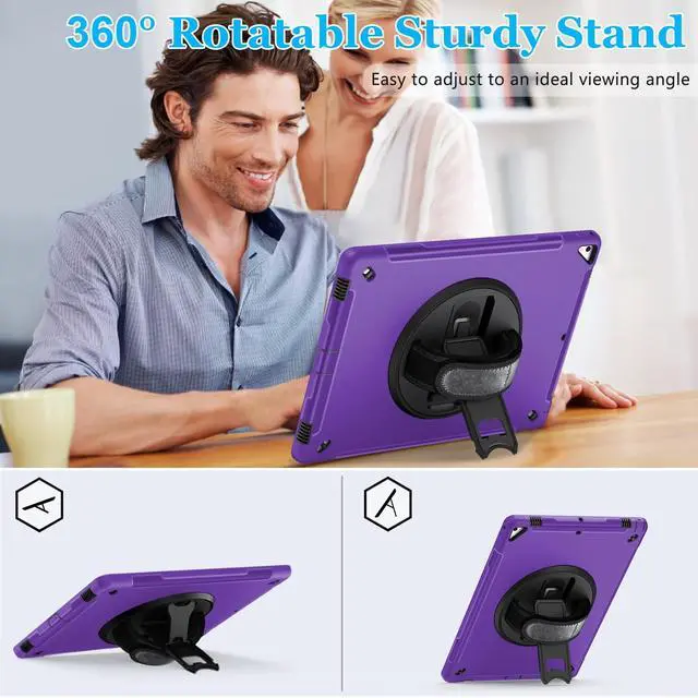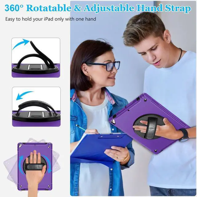 DEGREE ROTATING STAND: There is a sturdy swivel foldable stand. View your iPad in horizontal and vertical mode. Convenient for watching videos, conferences, construction, Free your hands. ^^ ADJUSTABLE HAND STRAP +