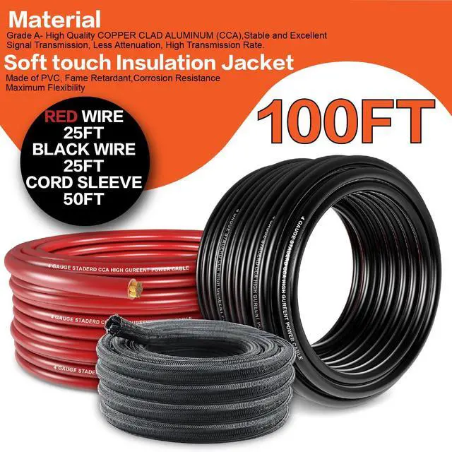 4 GAUGE 25-FEET( 7.6 m) OF EACH COLOR BLACK & RED CCA POWER GROUND WIRE - The lower the gauge number, the thicker the wire. Thicker wire presents less resistance to current flow. Copper coated aluminum gives you an economic power cable with excellent power transfer. Accompanying Cable Protector is split and easy to load wires. Once loaded, our cable sleeve will close on itself and perfect wire wrap. ^^ HIGH QUALITY MATERIALS - High quality stranded CCA wire offers strong power transfer performance, while remaining lightweight with maximum flexibility. Oxygen Free Coppe (OFC) wiring provides a superior electrical conductor to aluminum because it does not expand or contract with heat and can carry a higher current load.