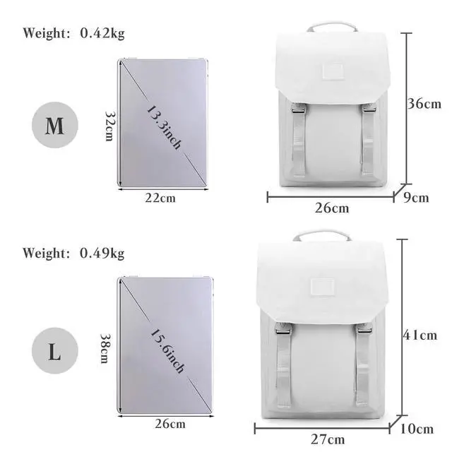 Weight: 0.42 (M) / 0.49 (L) kg. With 1 main pocket, 1 front pocket, 1 shockproof laptop compartment(up to 14 (M) / 15.6 (L) inch). Large backpack can easily store books, notepads, laptop, power bank, water bottle, etc.
