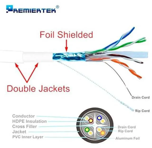 Premiertek Direct Burial CAT6 FTP is used for applications that require the cable to be outdoors or directly in ground with or without the use of a conduit. Direct Burial CAT6 is made with a polyethylene (PE) jacket to protect the cable from water, and extreme temperatures. Four color-striped pairs make it easy to install and reduces alien crosstalk. This cable can be measured and cut to exact distances, then terminated to a connector, jack, or patch panel. This CAT6 cable is certified and fluke tested for gigabit Ethernet and 550Mhz.