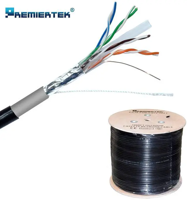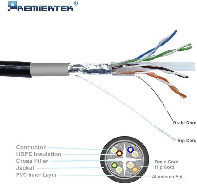 Premiertek direct burial Cat6 FTP is used for applications that require the cable to be outdoors or directly in ground with or without the use of a conduit. Direct burial Cat6 is made with a polyethylene (PE) jacket to protect the cable from water, and extreme temperatures. Four color-striped pairs make it easy to install and reduces Alien crosstalk. This cable can be measured and cut to exact distances, then terminated to a connector, jack, or patch panel. This Cat6 Cable is certified and fluke tested for Gigabit Ethernet and 550MHz.