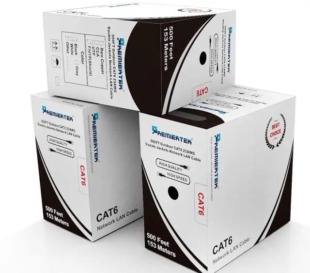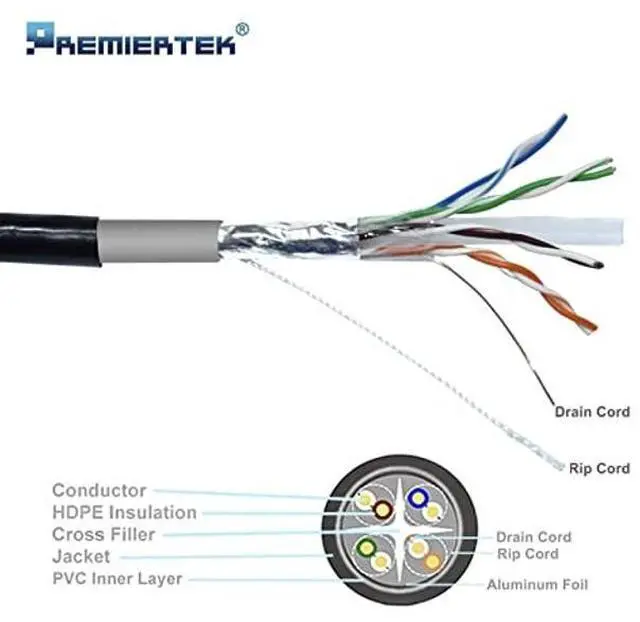 Premiertek Direct Burial CAT6 FTP is used for applications that require the cable to be outdoors or directly in ground with or without the use of a conduit. Direct Burial CAT6 is made with a polyethylene (PE) jacket to protect the cable from water, and extreme temperatures. Four color-striped pairs make it easy to install and reduces alien crosstalk. This cable can be measured and cut to exact distances, then terminated to a connector, jack, or patch panel. This CAT6 cable is certified and fluke tested for gigabit Ethernet and 550Mhz.