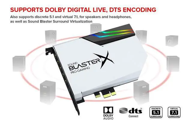 • SUPPORTS DOLBY DIGITAL AND DTS Now with support for Dolby Digital Live and DTS Encoding for even more delivery options to your external audio devices! The AE-5 Plus Pure Edition also supports 5.1 discrete and 7.1 virtual surround, as well as Sound Blasters Surround Virtualization technology
