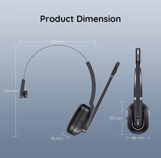 Every feature is engineered for maximum comfort. This ergonomic design keeps pressure off your head, preventing soreness or fatigue over time. This wireless headset with microphone for pc is built for your comfort and stay fully productive all day. ^^ Ultra-Lightweight & Mute Function The ultralight mono headset (only 75g, 2.64 oz) allows for all-day comfortable use and lets you forget it is here on your head. The 270-degree rotatable mic helps to pick up your voice with exceptional clarity. Plus, the ambidextrous design allows you to switch up your either left or right ear as the listening ear on the fly! If you feel the need, you can quickly mute your voice during calls, just pressing the mute button on the microphone.