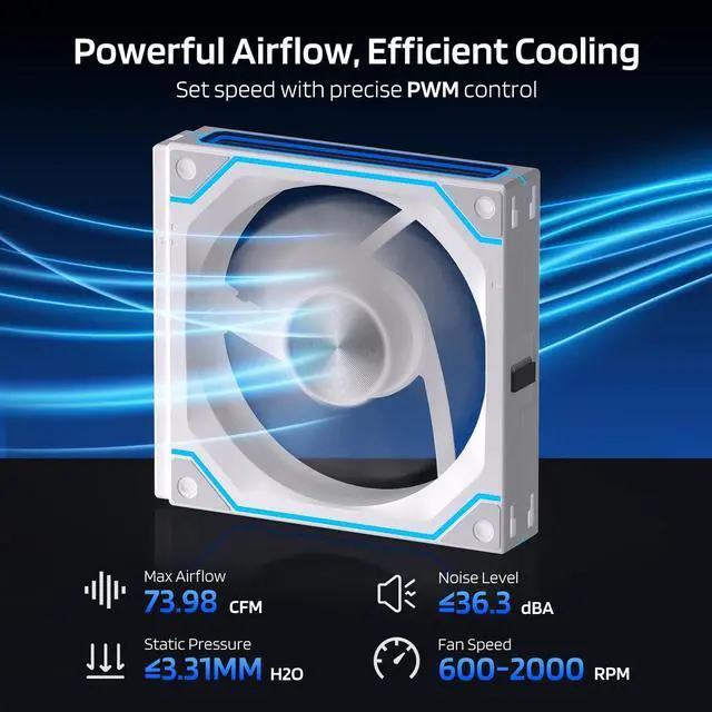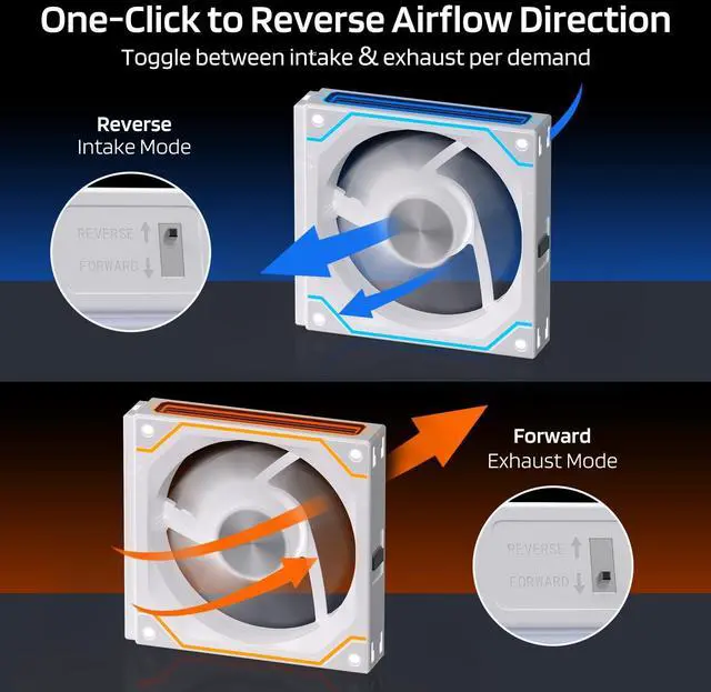 One-Click Reversible Airflow Adapt your cooling strategy on demand with one-button switching between intake and exhaust modes. The reverse (intake) mode draws cool air into your case, while the forward (exhaust) mode expels warm air. Eliminates the need for physical reinstallation, providing ultimate flexibility for any case configuration ^^ Infinity Mirror & ARGB Sync --- Elevate your setup with stunning infinity mirror visuals and vibrant ARGB effects. Easily sync with major motherboard platforms like ASUS Aura Sync and MSI Mystic Light through the standard 5V 3-pin interface for seamless customization ^^ Powerful Airflow, Efficient Cooling --- 4-Pin PWM supports intelligent speed control from 600 to 2000 RPM.