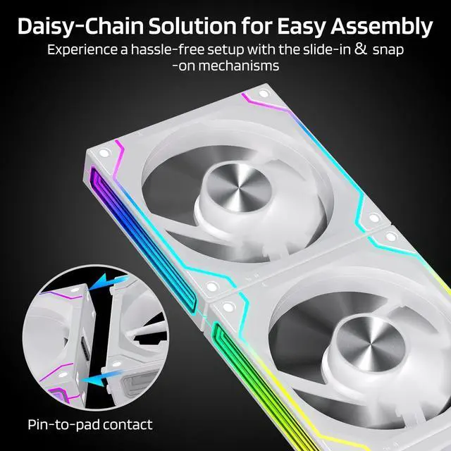 Delivers robust cooling with 73.98 CFM airflow and 3.31 mm-HO static pressure for efficient heat dissipation. Keep your system running efficiently during intense gaming sessions and demanding tasks ^^ Daisy-Chain Connection --- Experience hassle-free setup with our daisy chain case fans featuring slide-in and PIN-to-PIN interlocking mechanisms. Streamline your setup with just one cable required for each fan cluster, achieving easy cable management without mess ^^ Extended Lifespan --- The low-noise 120x120x25mm fan adopts HDB bearings that provide low-friction and low-noise operation for extended lifespan and quieter performance. Rubber pads on each corner reduce noise and vibration effectively