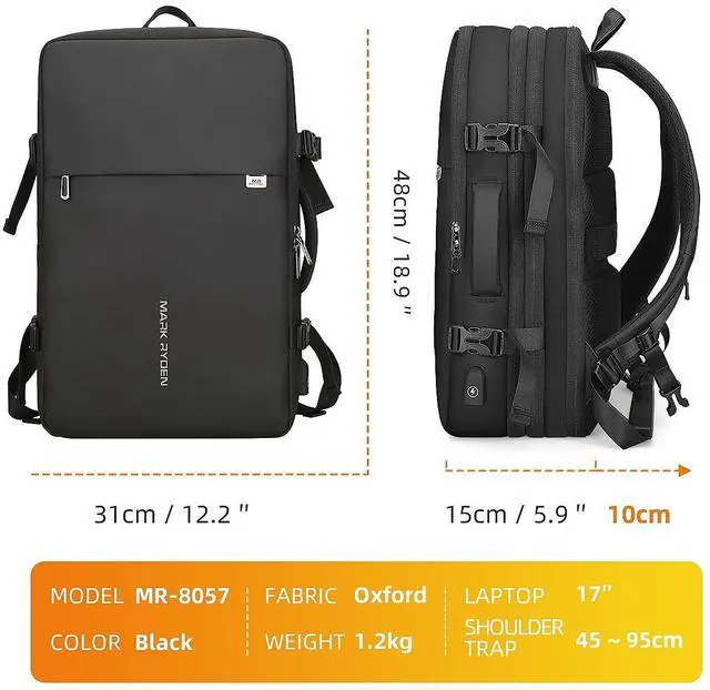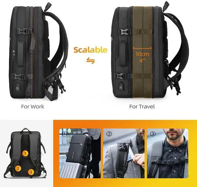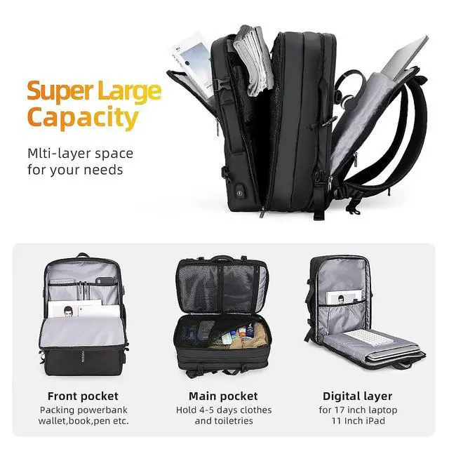 EXPANDABLE TRAVEL BACKPACK It expands by nearly 40%, after extended is 45L and it is great for 3-7days daily travel, it's a comfortable, large capacity backpack with two handles on the top and sides for easy switching between backpack and luggage, and it's the perfect size to fit under the seat of an aeroplane, so you can take it on board as a personal item ^^ SPACIOUS AND FLEXIBLE STORAGE The carry on backpack features multiple compartments designed to separate and secure items and protect fragile items; it has a padded 17.3 inch laptop compartment, an extra-large mesh compartment, an extra-deep front pocket and an anti-theft pocket on the back, which not only protects the laptop, but also helps you to keep everything organised and to access different items quickly ^^ MULTIPURPOSE BACKPACKThe shoulder straps and back are thickly padded to take the pressure off your shoulders and make it easier for you, even when you put heavy objects on it.