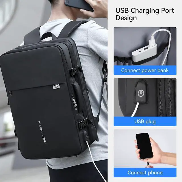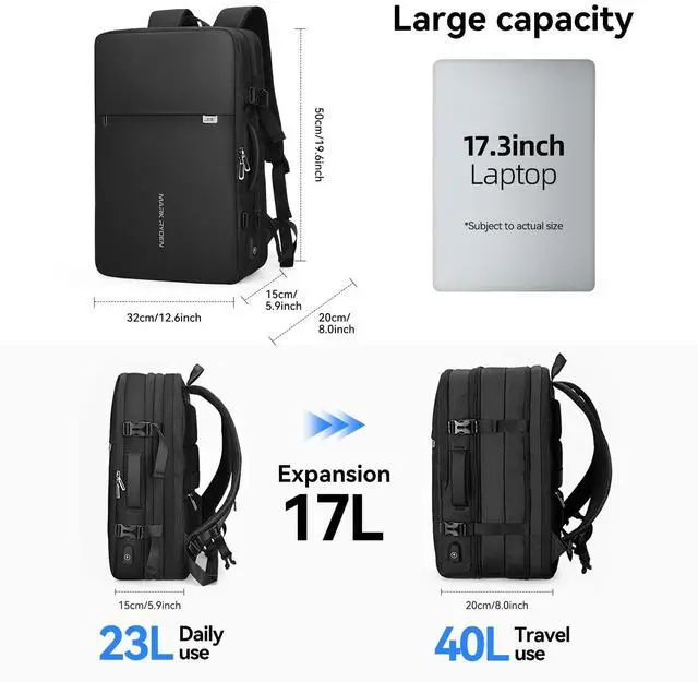 Expandable Large Capacity: Compressed capacity of 23L, full-expansion zipper creates 30% percent more packing space, capacity up to 40L, total three layers. The first compartment can store your phone, passport or other small items etc. The second compartment can store clothes and daily supplies. The third compartment is a laptop compartment, which can store a 17.3 inch laptop as well as 15.6 inch, 14 inch and 13 inch Laptop. ^^ USB