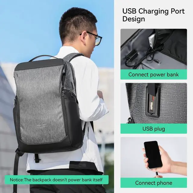 Charging Port Design: Dual USB to external ports with dust-proof cover. There is a standard USB-A and the newer USB-C with two corresponding cables on the inside, which make this especially valuable at airports that don't have enough plugs. Just whip out your portable powerbank and you're good to go by just plugging into the exterior of your backpack, or interior from the exterior.