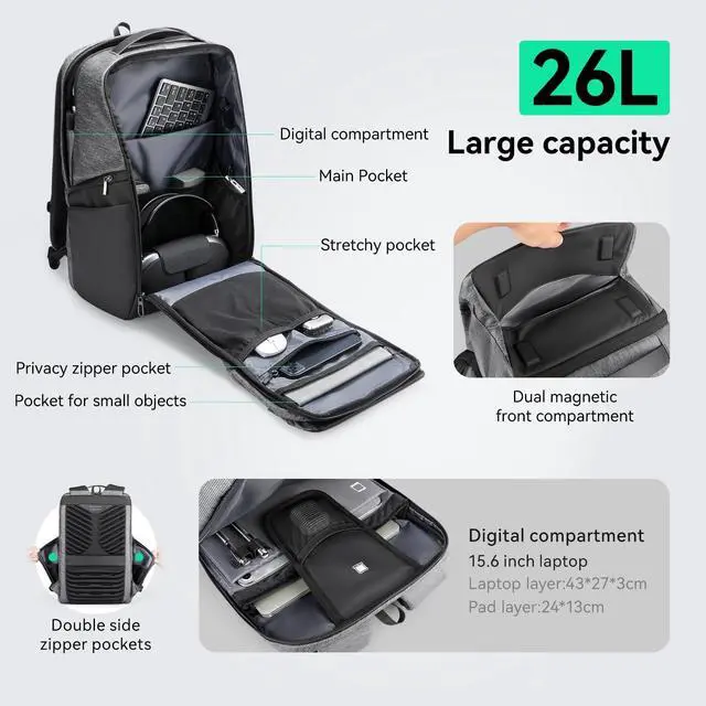 ^^ Multi-functional Design: The back of backpack panel has great padding that offers airflow and is super comfortable, which even has a really nice sternum strap with a whistle. Absolutely love the magnetic flap at the top with the shallow pocket for my phone and wallet and sunglasses. Magnet is super strong so no concern about stuff dumping out by accident. In addition there are YKK Zipper design, luggage strap design, waterproof fabric design, etc.