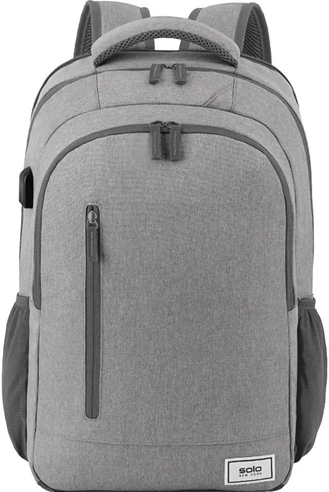 The Re: Define Laptop Backpack (18" x 13" x 7") is perfect for commuters and travelers. The exterior heathered grey material is made out of Recycled PET bottles, providing a sustainable choice to carry your belongings. You can easily wipe down the surface with a damp cloth to clean. This backpack is feature rich with a checkpoint friendly design, allowing you to pass through airport security with ease. Recharge your phone or other electronics with the external USB port. It even comes with a headphone port so you can feed your wires through the backpack for a hands free experience. Tired of carrying your backpack? The external back strap slides over most luggage handles so you can travel with ease. This bag comes with a 5 year warranty.