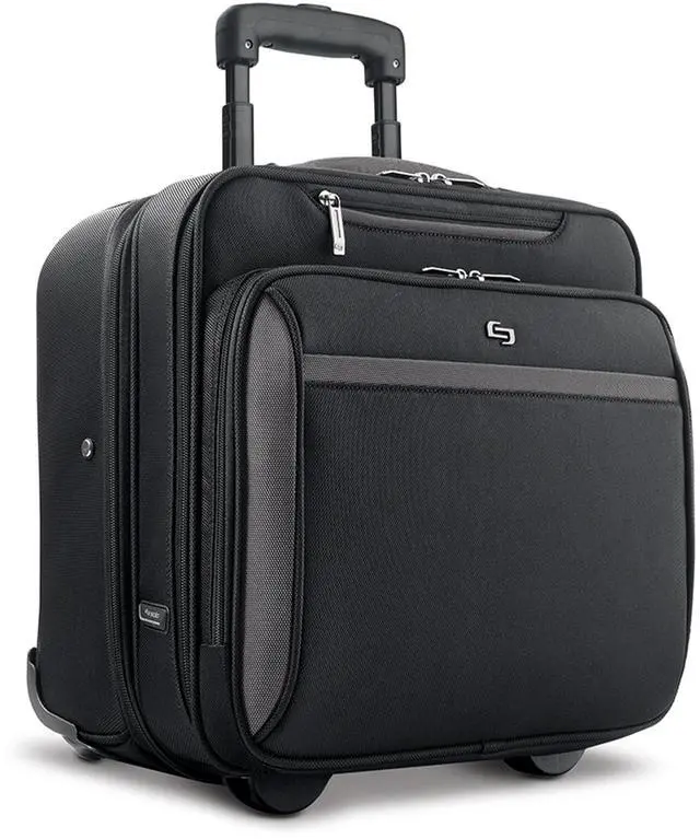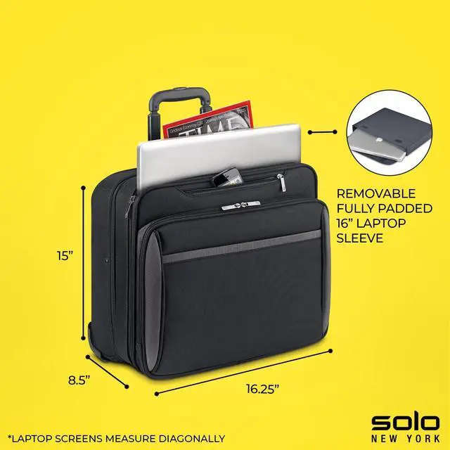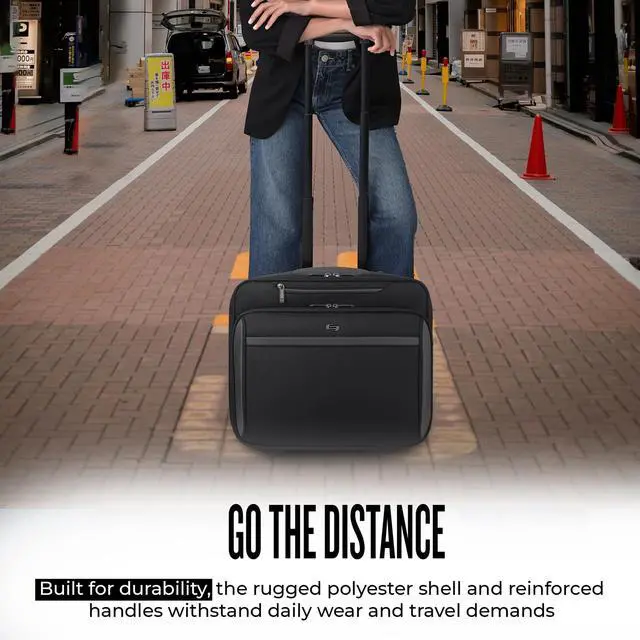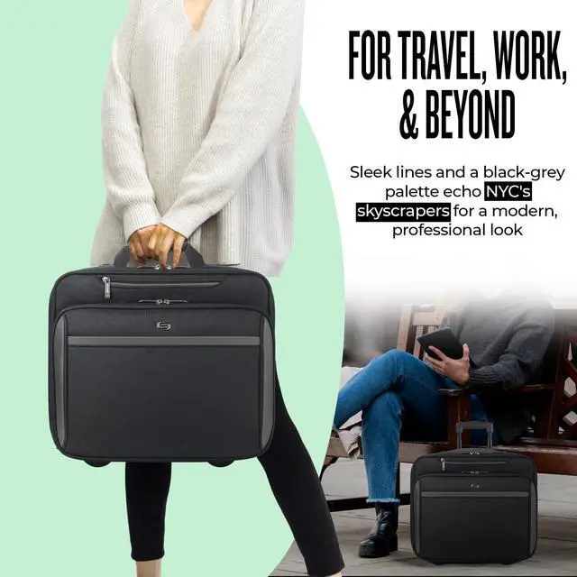 WHEELED TRAVEL CASE - This case measures 15" x 16.25" x 8.5" and features smooth-rolling wheels, allowing for effortless maneuverability through airports and offices ^^ ROLLING LAPTOP BAG - Protect your tech and keep devices secure and easily accessible wherever you go with the removable and fully padded 16" laptop sleeve ^^ VERSATILE USE - Ideal for work and business travel, this rolling case offers a practical and stylish solution for carrying your daily belongings ^^ EFFICIENT ORGANIZER - This roller bag features a front zip-down organizer section, divided file compartment, and padded carry handles for streamlined travel ^^ PUSH-BUTTON HANDLE - The push-button telescoping handle system allows for easy maneuvering, offering comfort and ease while rolling your bag through busy airports