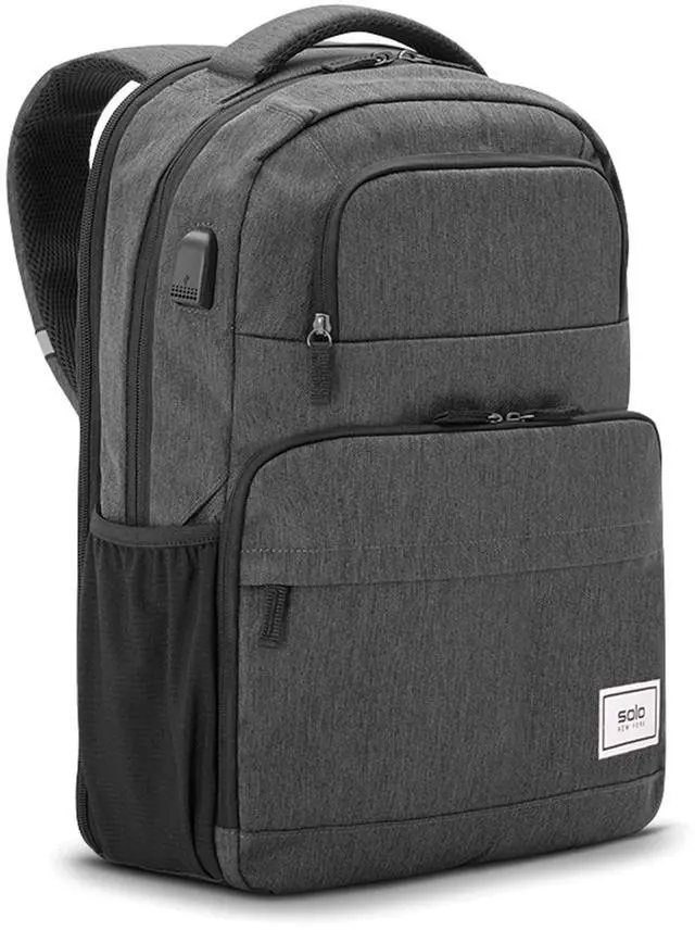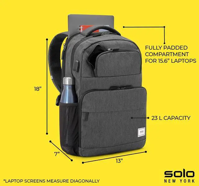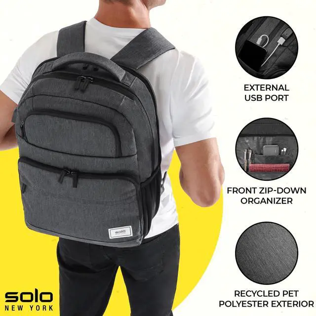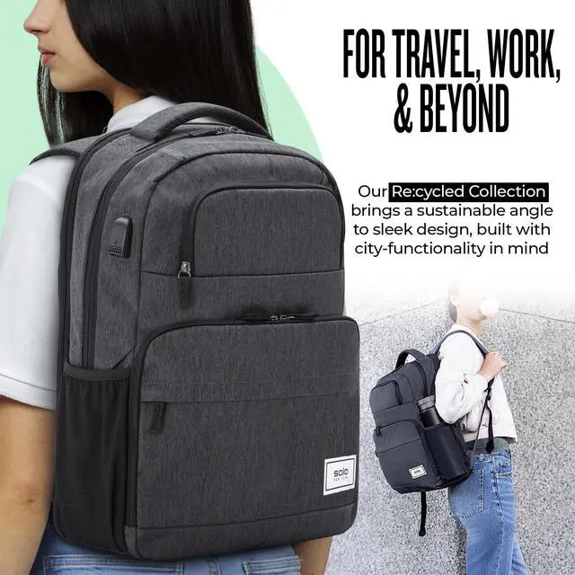 LIGHTWEIGHT BACKPACK - Designed for business travel and work, this polyester backpack is lightweight and compact, with a carry on size of 18 x 12.25 x 4.75" for convenience on the go ^^ LAPTOP COMPARTMENT - Protect your tech with the fully padded 15.6" laptop compartment with lockable zippers, keeping your device secure during travel or everyday use ^^ EFFICIENT ORGANIZER - Stay organized while traveling with an external USB port and RFID data protection pocket, helping to secure personal data encoded on your credit cards, IDs, and passports ^^ THOUGHTFUL DETAILS - This backpack includes a back strap to slide over luggage handles and features a black camo interior lining, adding style and functionality to your daily carry ^^ SOLO SUSTAINABILITY -