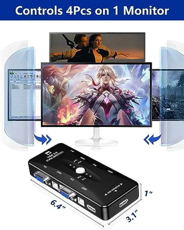 Support: DOS, Win 3. X, Windows 95/ 98/ 98SE/ ME/ 2000/ XP/ Vista, WinNT, Netware, Unix, Linux. 16. Shares USB device such as USB Printer, USB Scanner, USB Flash Drive, USB HUB and etc... 17. This KVM switch can controle multiple PCs from One Keyboard, Mouse and VGA Monitor. It has complete keyboard and mouse emulation for simultaneous PCs boot-up process. 18.
