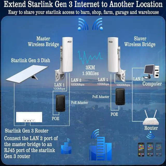 Compatibility with Starlink Devices: This Point to Point Wireless Bridge is designed to work seamlessly with Starlink Mini, Starlink Gen 2 with Ethernet Adapter and Starlink Gen 3 Router. This ensures that users with different Starlink generations can enjoy reliable internet connectivity without any hassle. The compatibility enhances user experience by integrating effortlessly with existing Starlink systems, making it a versatile choice for all Starlink users.