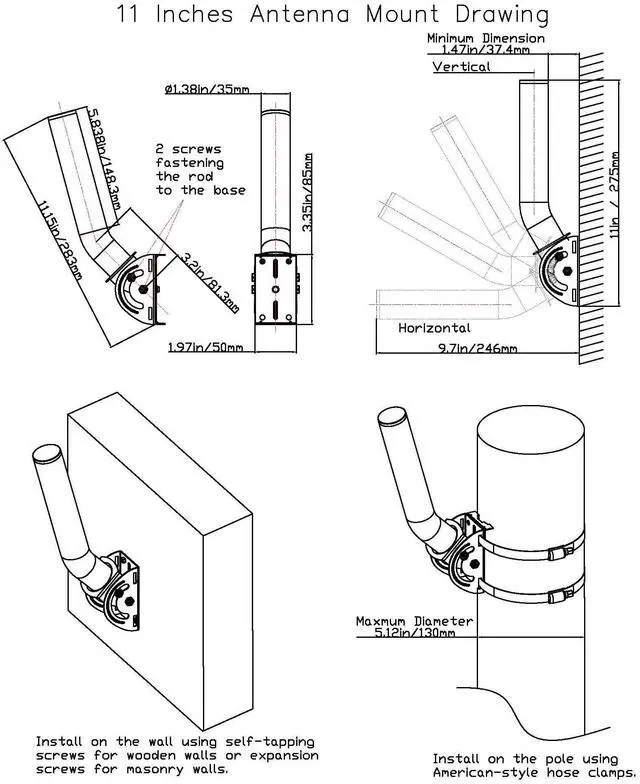 Pole Installation: This point to point wireless bridge mount bracket is 11 inches hegight and the rod dimater is 1.38 inches. It offers the flexibility to be mounted on either a wall or a pole, allowing you to choose the installation method that best suits your needs. This convenience makes it easy to set up according to your preferences.