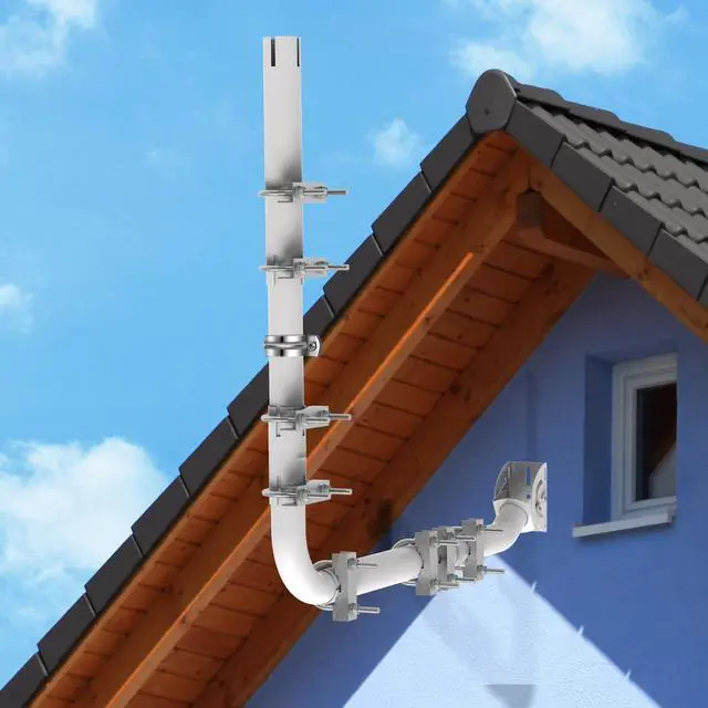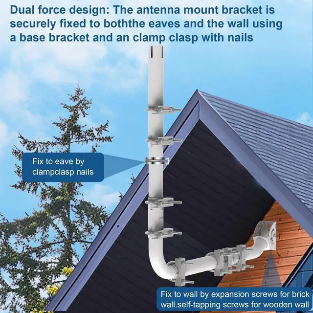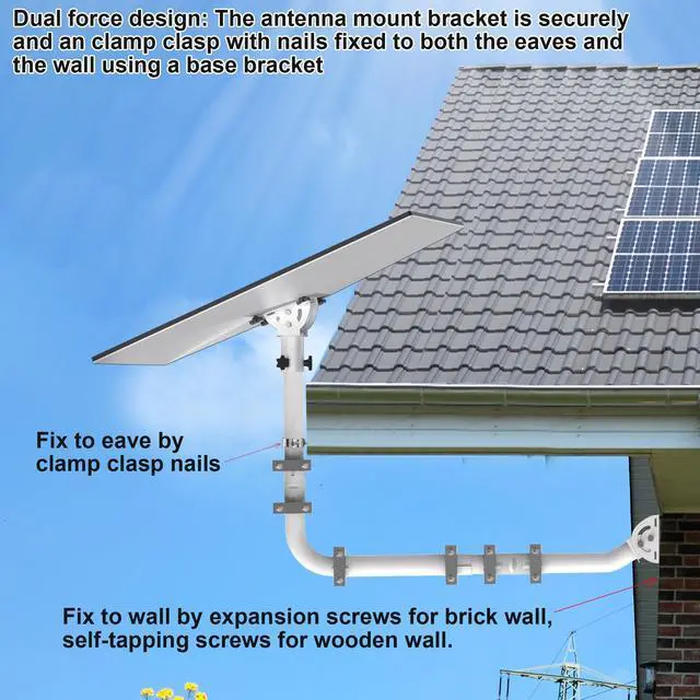 ^^ Adaptive installation: The design of the base wall antenna mounting bracket and extension pipes allows for flexible installation, adjusting installation distance and angle according to your specific eaves situation. You can shorten or replace the pipes to extend the installation distance to suit your eaves, achieving optimal installation results.