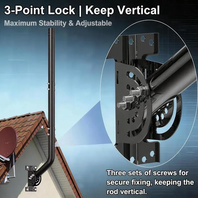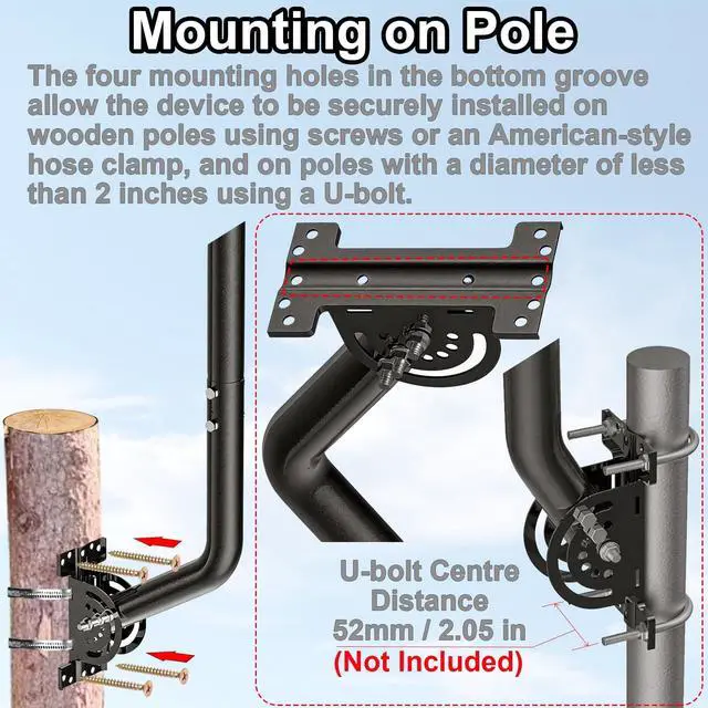 Versatile 180-Degree Adjustable AngleThe mount is equipped with a flexible top angle adjustment of up to 180 degrees, allowing for customized installation options. This adaptability is especially useful for securing long rod devices, such as the Starlink dish and outdoor TV antennas, providing two pivot points to enhance resistance against strong winds. Durable Iron ConstructionCrafted from premium iron and coated with zinc for enhanced rust and corrosion resistance, this heavy-duty wall mount kit is built to last. It includes robust brackets with lag bolts, ensuring dependable performance for outdoor setups. Wall and Pole MountingVersatile in its installation options, this bracket includes concrete expansion screws and self-tapping screws for wall mounting.