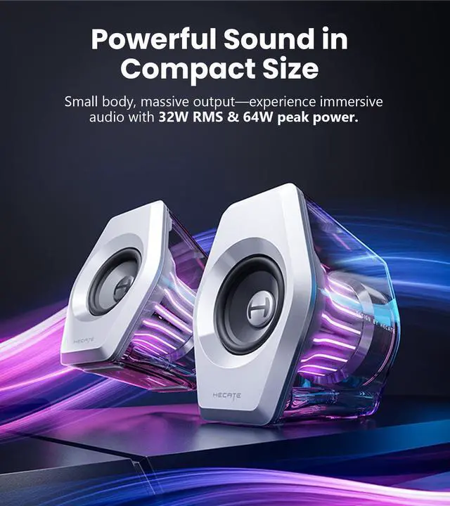 Compact Size, Big Soundstage: 32W RMS, 64W peak power and virtual 7.1 surround sound deliver explosive bass (75Hz) and precise enemy positioning for PC/PS5/Xbox gaming. 3-inch full-range drivers with dual bass reflex boost cinematic immersion. Compact 5.5×4.6×6.3-inch each, ideal for desktop setups.
