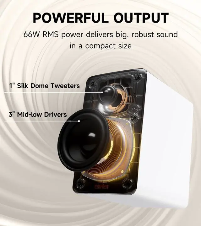[Compact and Delicate Design] Measuring 100mm (W) x 168mm (H) x 147 mm (D) per speaker, with the similar width and height of an often-seen mobile, the M60 is suitable for any desktop setup style ^^ [Powerful Output] The M60 has a total output power of 66W RMS, consisting of 18W+18W (mid-low) and15W+15W (treble), equipped with 1" silk dome tweeters and 3" long-throw aluminum diaphragm mid-low drivers, and features a high-efficiency closed-loop Class-D audio amplifier ^^ [High-Quality Audio Processing] Experience high-resolution audio with M series speakers, featuring full digital processing, Class-D amplification, and Hi-Res Audio certification for both wired and wireless transmission, along with precise two-way active crossover and dynamic range control provided by a built-in DSP ^^ [Multiple Inputs] The M60 offers versatile connectivity with Bluetooth V 5.3 for wireless streaming, and both USB-C and AUX inputs for wired connections ^^ [Bluetooth 5.3 Connectivitity] The Bluetooth V 5.3 audio receiver supports the LDAC codec, offering a maximum transmission bitrate of up to 990 kbps, enabling the streaming of high-resolution audio up to 24-bit/96kHz from Android devices running version 8.0 or later ^^ [User-Friendly Control] Enjoy intuitive control with a cap-sensitive touch panel, featuring an automatic backlight that activates as your hand approaches and turns off automatically.