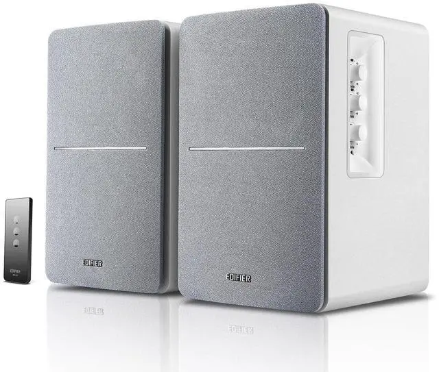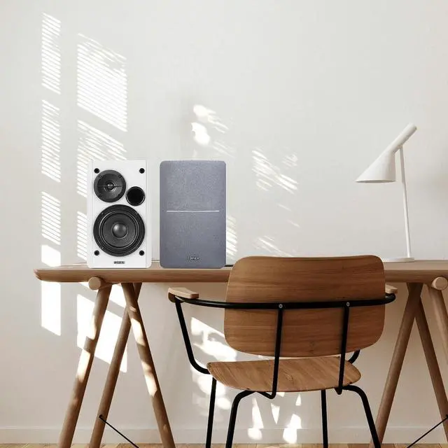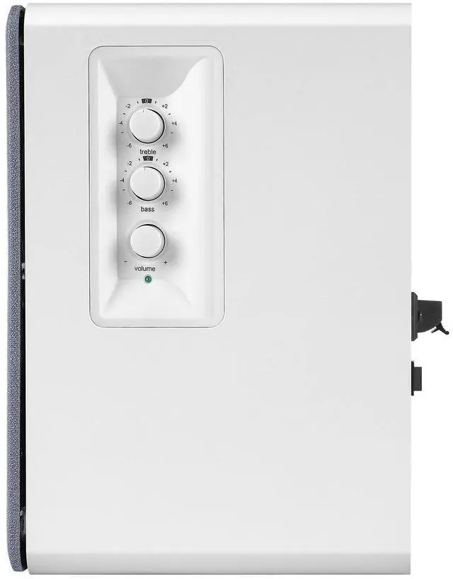 2 x AUX INPUT - Convenient connection to any device that has a 3.5 mm headphone output or dual RCA output. Connect to two devices via AUX at the same time, no plugging and switching needed. ^^ STUDIO SOUND QUALITY - Natural sound reproduction from 13mm silk dome tweeter and 4 inch full range unit ^^ REMOTE CONTROL - Adjust volume at your figure tips. Bass and treble control located on the side of main speaker. ^^ CLASSIC WOOD FINISH - High quality MDF wood build finished with wood effect vinyl serves as a great compliment to any home decor.