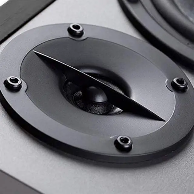 2 x AUX INPUT - Convenient connection to any device that has a 3.5 mm headphone output or dual RCA output. Connect to two devices via AUX at the same time, no plugging and switching needed. ^^ STUDIO SOUND QUALITY - Natural sound reproduction from 13mm silk dome tweeter and 4 inch full range unit ^^ REMOTE CONTROL - Adjust volume at your figure tips. Bass and treble control located on the side of main speaker. ^^ CLASSIC WOOD FINISH - High quality MDF wood build finished with wood effect vinyl serves as a great compliment to any home decor.