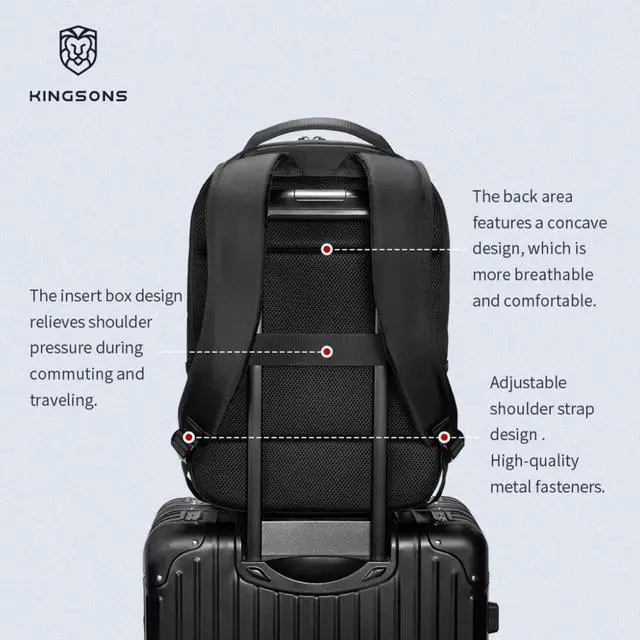 Business Laptop Backpack: Ideal for Work, Travel & Daily LifeTired of flimsy, non-waterproof backpacks or messy storage? The KINGTONS KS25458 solves theseblending durability, smart storage, and all-day comfort. It fits professionals, travelers, and commuters, working as a reliable laptop bag for meetings, water-resistant travel pack for getaways, or practical work backpack for men & women. Durable Water-Resistant PolyesterCrafted from high-strength, wear-resistant polyester, it resists fraying and broken zippers. Its water-repellent design protects your 15.6 -inch laptop, documents, and items from rain or spills. At 0.68 kg, its lightweight for all-day carry yet tough for long-term use. 18L Capacity + Smart StorageWith dimensions L30xW15H44cm/ 11.8 x 5.9 x 17.3 in, its roomy yet slimperfect for airplane bins or lockers. It has a padded dedicated compartment for 15.6 -inch notebooks, plus internal pockets/mesh bags to organize cables, adapters, and phones. Two side pockets offer quick access to umbrellas or water bottles. Ergonomic ComfortDesigned for all-day wear, it has a concave breathable back panel to prevent sweating. Thickened cushioned shoulder straps distribute weight evenly and are fully adjustable for all body types.
