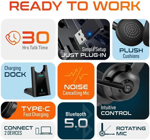 Delton 35X Bluetooth Computer Headset with Noise Cancelling Mic, Fast Charging Dock, Auto Pair USB Dongle for PC, Laptop, MacBook, Compatible with MS Teams, Google Meet, Zoom, Slack, and More - Black