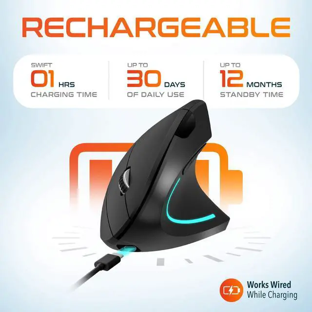 Delton Ergonomic Vertical Rechargeable Wireless Mouse with Auto Pair USB Dongle, 6 Buttons, 3 Adjustable DPI Levels (800/1200/2400), Compatible for PC, Laptop, Mac, Chromebook - Black