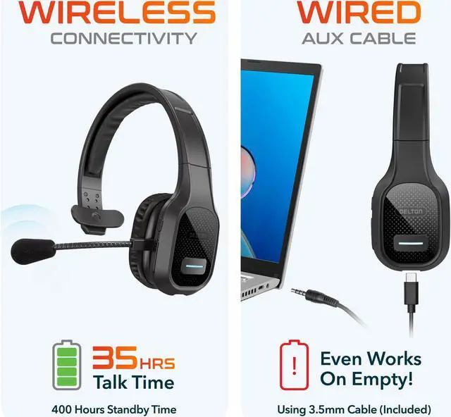 Delton Wireless Computer Headset, Trucker Bluetooth Headset with Noise Canceling Microphone, 35Hrs Talk time, Wireless Headset for Computer, Cell Phone, Drivers, Office, Call Center Work - Black