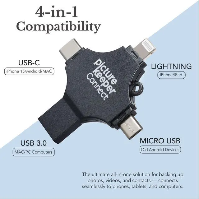 • Photo Backup Drive Solution: Easily copy, store, and protect photos, videos, and contacts with this lightning, USB-C, Micro USB, and USB flash drive for iPhone, Android, Mac, and PC devices