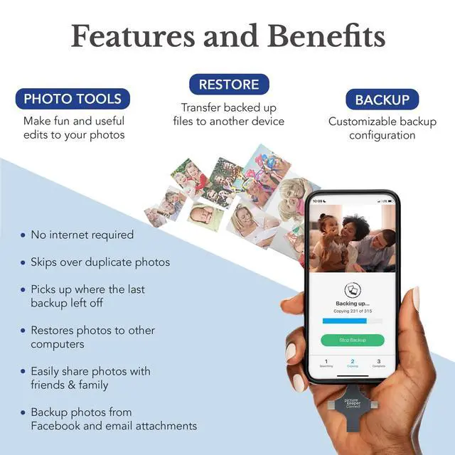 • Multi-Device Compatible: Picture Keeper is compatible with iPhones and iPads with iOS 12 and newer, Android 5 and newer, Windows 7 and newer, and Mac OS 10.3 and newer