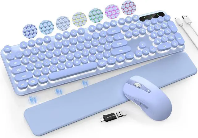 Wireless Keyboard and Mouse Backlit - Typewriter Keyboard with Retro Round Keycaps, Detachable Wrist Rest, Light Up Letters, 2.4G Rechargeable Combo for Mac, Windows, PC, Laptop, Trueque (Purple)