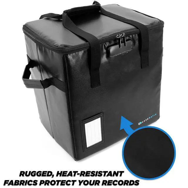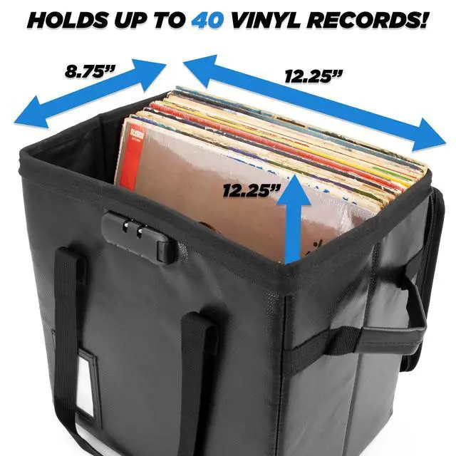 Records: Transport or store up to 40 of your favorite records with this folding vinyl storage case. The interior measures 12.25" x 12.25" x 8.75" and is the perfect carrier for storing your collection or for bringing home new records. ^^ Fire-Resistant Vinyl