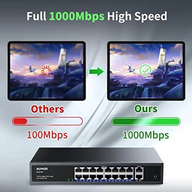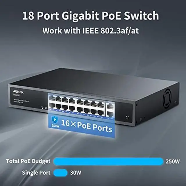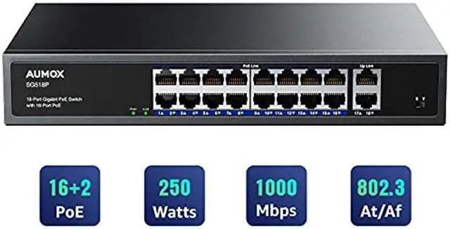 [(Connect all your devices with gigabit switch)] : Aumox gigabit PoE ethernet switch offers 18*10/100/1000 Mbps Base-TX RJ45 ports, including 16 PoE ports which automatically identifies and powers PoE devices. Built-in power supply makes adapter no more needed, easier to use.