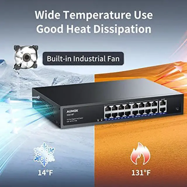 [(Sturdy metal casing and less noise)] : Sturdy metal casing and powerful industrial-grade fans for better heat dissipation while effectively reducing noise, enabling longer-lasting operation in a variety of temperature environments, making the switch run more stable.