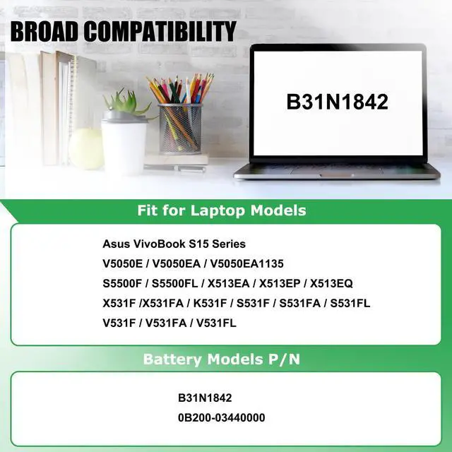 [(Battery Specification)] Model Name: B31N1842; Voltage: 11.52V; Capacity: 42Wh / 3653mAh; Battery Type: Li-ion; Condition: 100% brand new from manufacturer; Color: Black; Packaged come with: 1*battery + battery installation screwdrivers + 1*instruction for laptop battery