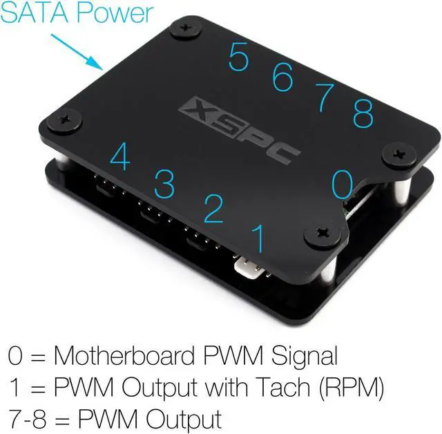 The XSPC PWM hub can power 8 fans simultaneously, while only taking up one PWM fan header on your motherboard. With a total output of 95W (~12W per channel), the hub can be expanded with Y splitter cables for additional fans (channels 2-8 only), taking the total supported fans to 15.