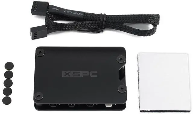 The XSPC PWM hub can power 8 fans simultaneously, while only taking up one PWM fan header on your motherboard. With a total output of 95W (~12W per channel), the hub can be expanded with Y splitter cables for additional fans (channels 2-8 only), taking the total supported fans to 15. At less than 15mm thick, the hub can be tucked away behind the motherboard tray, for neat cable management. The hub is supplied with an adhesive hook/loops pad, making it easy to mount it anywhere in your case. The hub can also be used with 3pin fans without PWM speed control, or run PWM fans at full speed by disconnecting the motherboard PWM input cable.