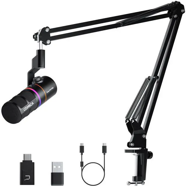 Gain Control: Move left or right to adjust four mic gain levels. Plug in 3.5 mm headphone to monitor the mic in real time. In case of emergency, you can use one-click muting function to avoid recording unnecessary sounds. Various settings of this professional studio microphone ensure that the sound status during the recording process is under control. ^^ Dynamic Radiant RGB LightShort press to adjust Audio Dynamic/Comica Orange/ Sea Wave/Colorful Breathing Light/RGB Slow Wave/Rotating Rainbow six RGB light effects. Vibrant RGB lights ignite an incredible live stream atmosphere. Short press to switch bass, nature or bright three kinds of EQ effects, this RGB dynamic mic bringing you different gaming and streaming experiences. ^^ Battery Life Up to 45 Hours in Wireless ModeEJoy D10 PRO wireless RGB microphone supports long battery life and charging during using. In wireless mode, the battery life can last up to 45 hours. Users can fully focus on content creation without worrying about battery power. EJoy D10 PRO has optional boom arm and desktop stand, this one is a boom arm.