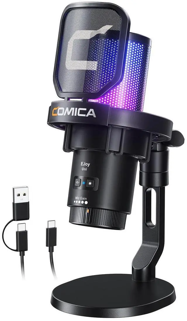 ^^ RGB Dynamic Light EffectComica Uni studio gaming microphone features three vivid RGB modes that elevate your setup. The lighting can smoothly cycle through seven colors in a soft breathing glow, shift in a dynamic gradient that automatically changes every 3 seconds, or react in real time by changing colors based on your speaking volumeadding energy and visual style to any streaming, gaming chat, or broadcast environment. ^^ Convenient Gain Knob & Real-time MonitoringA knob-style gain control allows one-handed sensitivity adjustment for whispers, commentary, and microphone for pc streaming. This USB podcast microphone can be plugged into 3.5 mmTRS/TRRS headphones for real-time monitoring, allowing you to listen to the recorded content in real-time without echo or delay.