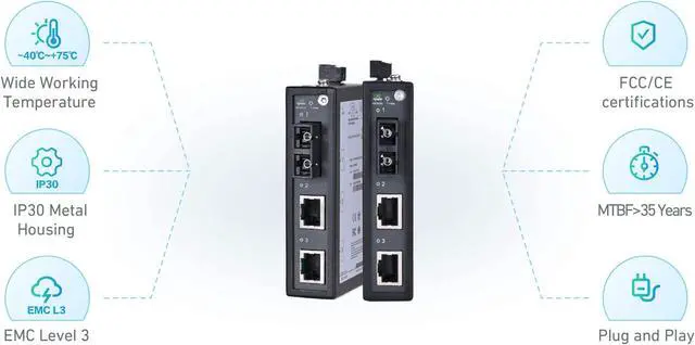 Industrial Ethernet Switch: This network switch include 2 fast Ethernet ports (2 * 10/100 Base-T(X) adaptive RJ45 ports) and 1*100Base-FX (1 * single mode dual-fiber 20km 1310 transmit-receive), support 10/100/ rate, switching capacity up to 16Gbps, Transmission Distance can reach to 20 KM.